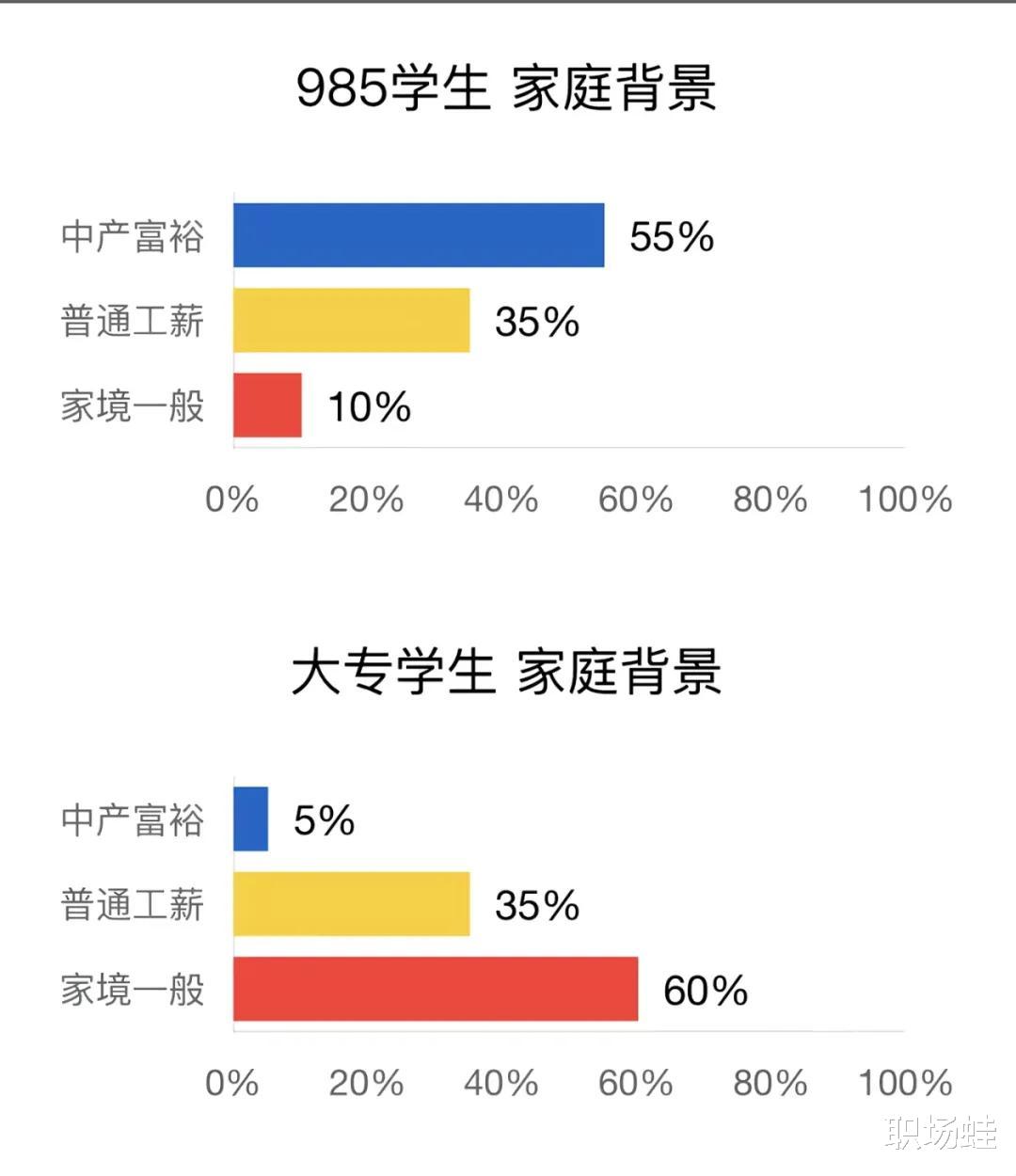 你看上图,上了985大学的人,其家庭经济情况一大半(55%)中产或富裕,读了大专就毕业的,则家境大多(60%)一般、35%很普通,只有5%是中产富裕。
