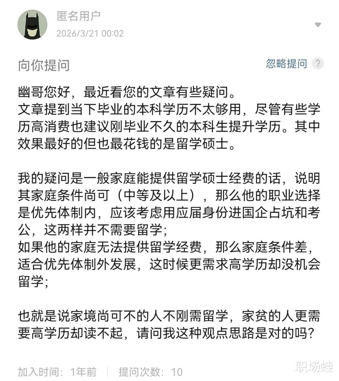 “我的疑问是一般家庭能提供留学硕士经费的话,说明其家庭条件尚可(中等及以上),”