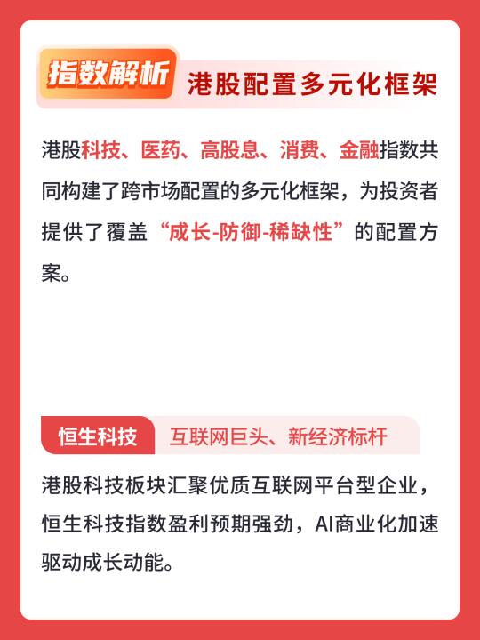 港股科技、医药、高股息、消费、金融指数共同构建了跨市场配置的多元化框架,为投资者提供了覆盖“成长-防御-稀缺性”的配置方案。