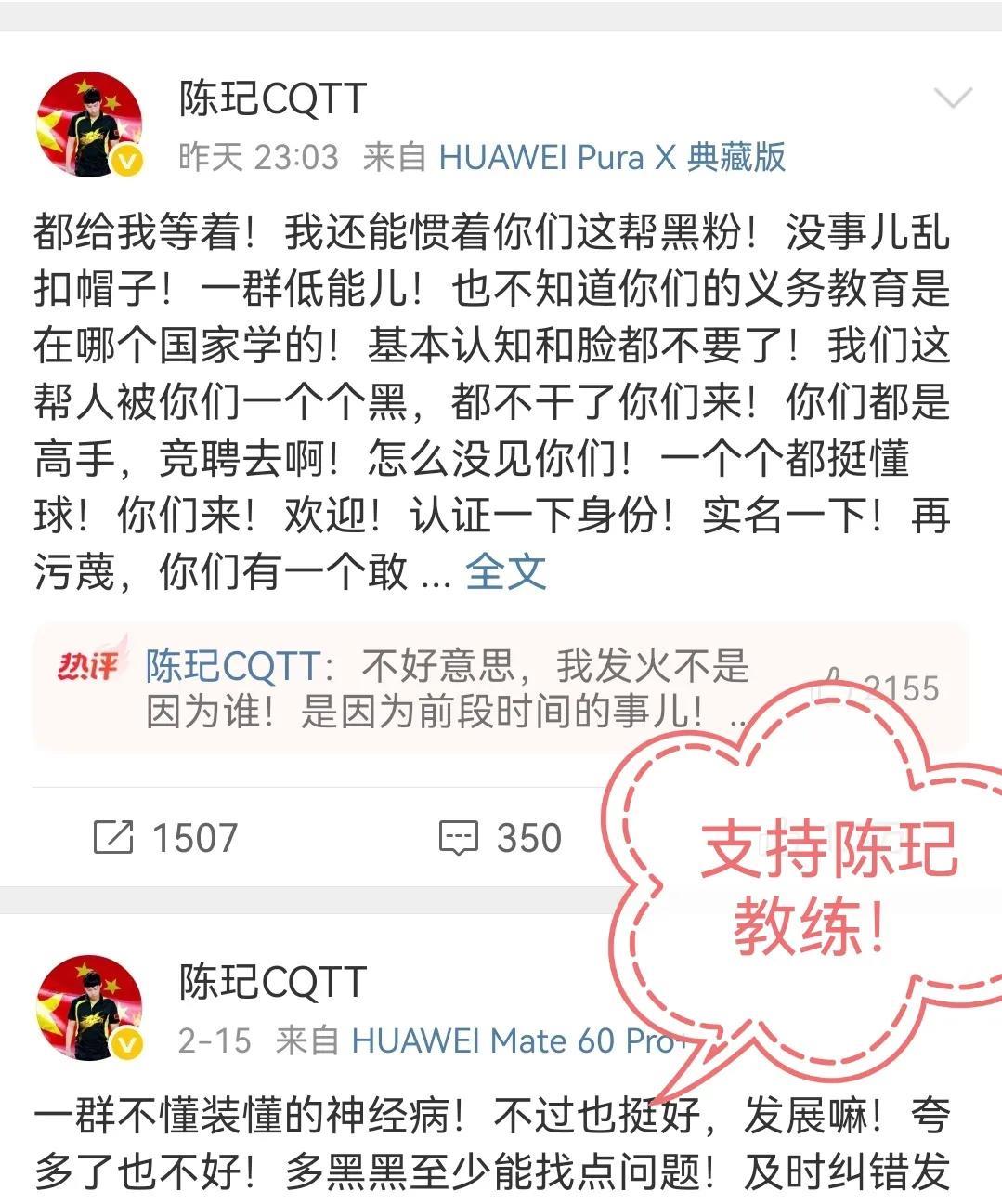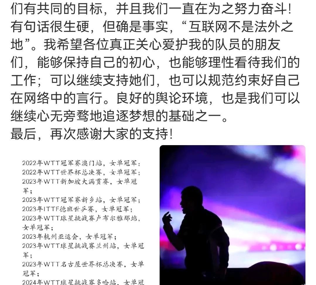 孙颖莎美国大满贯成绩不理想,网络黑子和莎莎的部分疯狂粉丝开始对邱贻可教练发起了攻击。 真的不知道这帮网络黑子,一天天的吃饱没事干,巴黎奥运后攻击王楚钦单打发挥不好,没完没了的诟病所谓的三十二强,现在王楚钦多哈夺冠了,美国大满贯也夺冠了,黑子又开始寻找下一个目标了。 最近有体育博主透露国家队教练都是合同制的,又到了教练员竞聘的时候了,因为孙颖莎和蒯曼这两名主力队员都在邱贻可教练手上,一群自以为是的黑子就在网络上头头是道摆起了龙门阵。 有人质疑邱贻可教练能力的,觉得孙颖莎需要更好的教练,也有对邱贻可教练带货口诛笔伐的,还有人怀疑河北队实力不如江苏队,邱贻可教练不再担任莎莎的教练的,总之就是咸吃萝卜淡操心。 网络不是法外之地,还网络清净,粉丝也好,球迷也罢,关注运动员的场上发挥就好。 每一名运动员身后既有各自省队做保障,乒协领导自有安排,运动员和教练员之间的适配度是他们互相选择的结果。 运动员也是人,不是神,他们也会有低谷期,没有任何一名运动员可以做到百战百胜,球迷关注运动员赛场上的表现就好,他们赢了我们鼓掌,他们输了我们一样支持,期待下一场可以赢回来,做一名理性的,有脑的球迷,不跟风,还网络安静