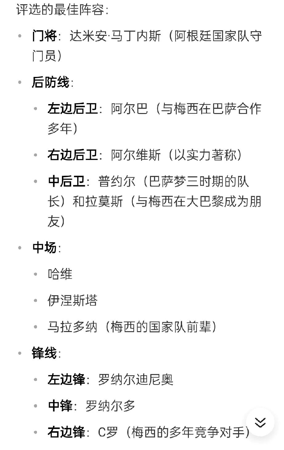 梅西这格局,不愧是球王! 在接受媒体采访时,梅西说出了他心目中的历史最佳11人。仔细一看,梅西到了俱乐部、国家队的师友,提到了一生之敌,唯独没有提自己! 11人中巴萨最多,包括大罗、小罗、哈维、伊涅斯塔、阿尔维斯、阿尔巴、普约尔等7人,说明梅西对巴萨感情之深! 阿根廷队次之,包括马拉多纳和大马丁。大巴黎也有1人入选,即变成梅西好友的拉莫斯! 令人意想不到的是,梅西将他的一生之敌C罗放在了前锋线上,这一安排估计C罗看了也会心生感慨! 梅西的名单中,唯独没有他自己!球王的胸襟和气度确实非常人所能及梅西
