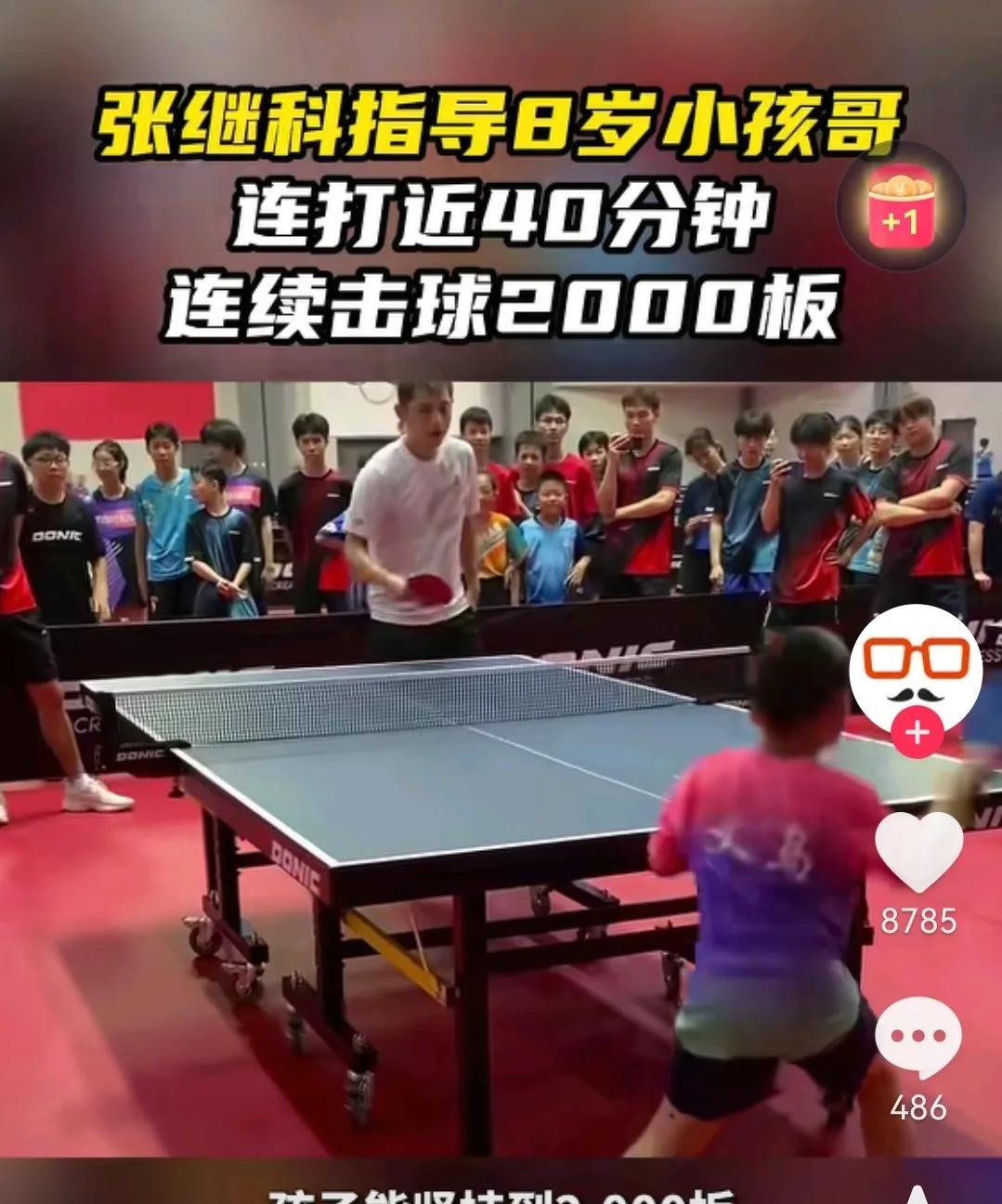 张继科这一次被八岁的小学员带火了,相信他是没有异议的了,以前谁说张指导蹭谁的流量,他总是一副哥很牛,哥不需要蹭任何人的热度,但是八岁小孩哥凭借连续接球2000次无失误,成功走红网络。 八岁萌娃正、反手连续挥拍2000次,无失误回球,这个不止需要孩子有足够的专注力,还要有顽强的毅力,赛场上我们看到20板左右的对拉,都觉得非常了不起了,国球荣耀人才辈出,张教练球馆小神童小荷初露。 原来这位八岁的小同学才练球一年,孩子的爸爸说孩子平时不太自信,对于孩子来说这一次和奥运冠军大满贯教练的对练,也许可以积极提升孩子的自信心。 偶像的力量是无穷的,张教练在乒乓球界的成绩大家是有目共睹的,而且张教练还告诉这位小同学,说他自己小时候练球最多也就练了1400次,确实别说2000次,可以连续接球500次都很棒了,孩子你真的很棒,加油早日走进国乒队!