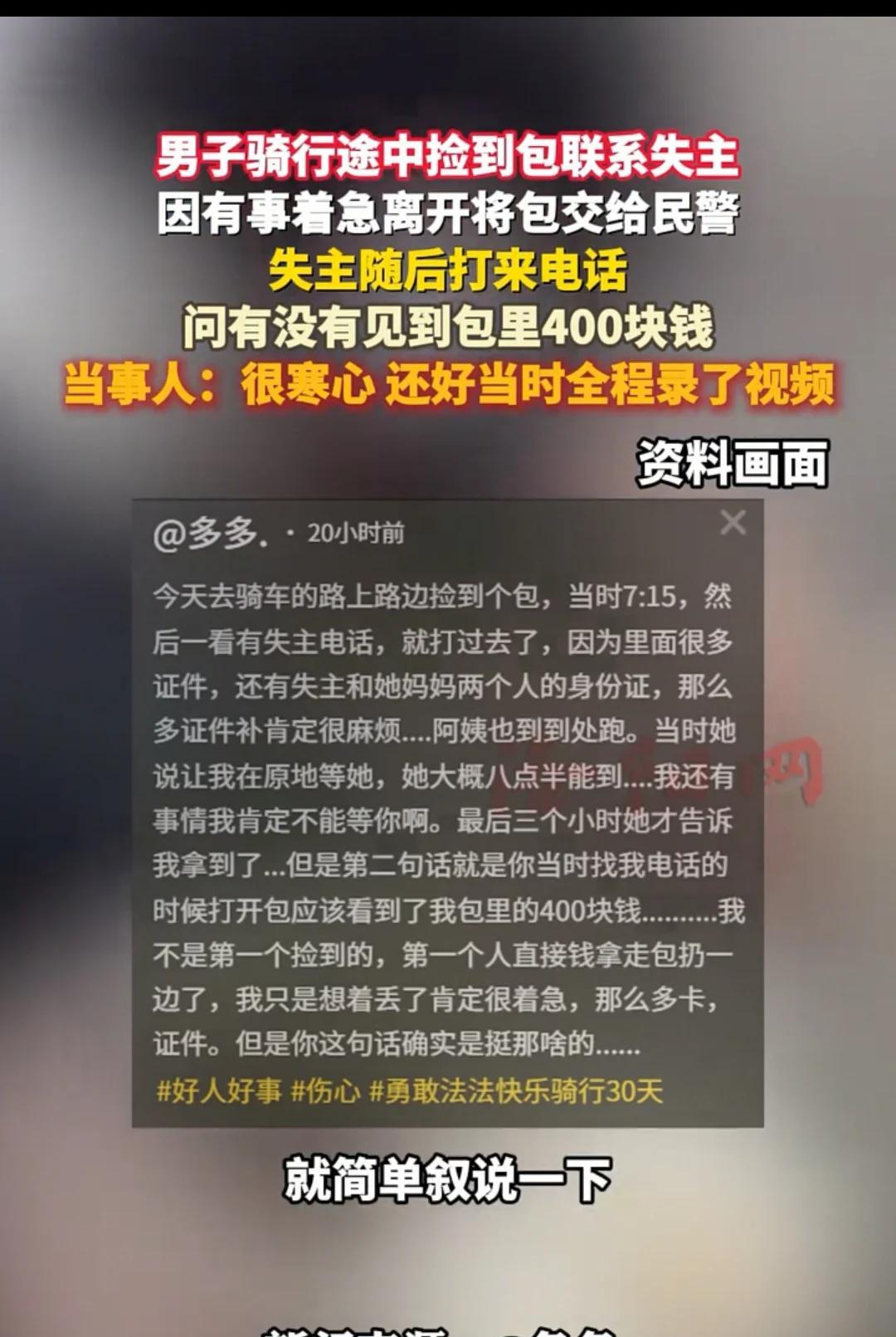河南,男子看到别人扔了一个包,他赶紧去捡起来,根据里面的电话拨打过去。最后失主拿到包后,却反问男子是否看到里面的400元钱。男子很不爽,觉得失主不信任自己,于是说自己不是第一个捡包的人,讲述完后直接挂断了电话。 据洛阳网7月17日报道,在7月16日早晨7点多的时候,男子骑着车正赶往上班的路上,远远地,他看到前面好像有一个人朝路边扔了一样东西,他很好奇这是啥呢? 过了两分钟后,他到达了那个人扔东西的地方,于是好奇地看了一眼,这时才发现是一个包包。 他心想,这么好的包包,怎么就随处扔掉呢?再说,要扔也不能扔在大马路边,应该扔在垃圾桶,所以感觉其中肯定有问题,于是好奇地下车想捡起来看看到底怎么回事。 他打开包包,看到里面有很多证件,并且在里面找到了对方的电话号码,于是就拨打了过去。 男子认为这个包包不应该是之前那个人扔掉的,而是另外一位失主的,因为里面有这么多证件,怎么可能扔掉?大家都知道办理这些证件太麻烦了。 很快,对方的电话就接通了,男子赶紧说道:“是不是你的包包掉了呀?”对方也激动地说:“是的是的,我都报警了,你在哪里呀?是不是你帮我捡到了?” 男子非常高兴,说:“你赶紧过来拿吧,我在哪个地方。” 对方说:“我可能要一个小时才能到,你在那里等等我好吗?”男子一听,不行呀,自己还要上班,于是说:“我给你拿到派出所,你到那里去拿吧,因为我还有事。” 就这样,双方的交流就结束了。不过到9点多的时候,对方打来了电话,称呼他为“老师”,并且问道:“你在给我打电话的时候,打开包包,看到我里面有400元钱了吗?” 男子一下神经就绷紧了:咋的,这还讹上我了吗?于是赶紧将事情的经过还原了一下,说:“我不是第一个捡到你包包的,是我看到别人扔掉后,觉得此处不该是扔包的地方,就去捡起来查看。我看里面只有证件,没有看到400元钱。”于是很不高兴地直接把电话挂断了。 最后男子也发了信息出来,表达了自己的不满:自己怎么做好事还反被怀疑呢?幸好整个过程都录了视频,要不然就说不清了! 网友们见状,也分成了两派。有人说,其实对方可能真的有400元钱,拿到包后没找到,可能就是想问一问,并没有说一定是你拿的,所以你也不要太敏感了,把事情说清楚就好了。 也有人说,男子可能是有一个心理落差,本来做了好事,认为别人肯定会百般感激,结果却成了被怀疑的对象,即使对方没有怀疑自己,可能自己也带入了这种感觉,心里很不爽。 也有人觉得这种事情就不要去掺和了,别人掉东西跟你有什么关系呢?何必冒着被别人怀疑的风险去做这等好事呢? 一、男子捡到包后的法律义务? 《民法典》第三百一十四条:拾得遗失物,应当返还权利人。拾得人应当及时通知权利人领取,或者送交公安等有关部门。 《民法典》第三百一十六条:拾得人在遗失物送交有关部门前,应当妥善保管遗失物。因故意或者重大过失致使遗失物毁损、灭失的,应当承担民事责任。 男子的行为符合法律要求:他联系失主、提议送派出所,履行返还义务,且未因自身过错损坏包内物品,尽到保管义务,完全履行了拾得人的法定义务。 二、 失主怀疑男子拿钱的举证责任? 《民事诉讼法》第六十七条第一款:当事人对自己提出的主张,有责任提供证据。 若失主认为男子拿了400元,需自行提供证据,如证明包内原本有钱的记录、男子接触钱的证据等。若无证据,无法认定男子拿钱,应承担“主张不成立”的后果。 三、若是前面捡到包的人拿了钱的法律后果? 《民法典》第九百八十五条:得利人没有法律根据取得不当利益的,受损失的人可以请求返还。 前面那个人构成不当得利,需返还400元,若已花费则需赔偿等额钱款。 《刑法》第二百七十条:将他人遗忘物非法占为己有,数额较大(一般2万元以上)且拒不退还的,构成侵占罪,处二年以下有期徒刑、拘役或罚金。 400元未达立案标准,即使前面那个人拿了钱,也不涉及刑事处罚。 对于这件事,大家又是如何看待的呢?