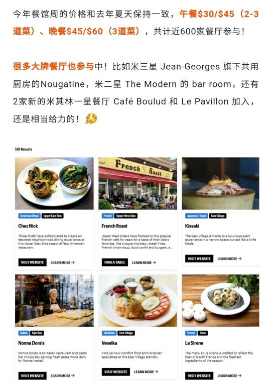 今年餐馆周,有近600家餐厅参与!价格保持不变,分成$30, $45, $60三个档位,性价比超高!吃货一年两度的快乐怎么能错过呢!