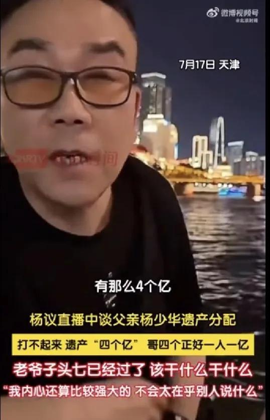 太牛了!杨议称父亲遗产4个儿子一人一亿!7月17日,天津,杨议在直播中谈及父亲杨少华的遗产,称,“放心吧,打不起来,表示父亲现金大概4个亿,哥四个正好一人一亿”,这也太牛了。 4个亿,这可是一笔天文数字的钱了,一般人每月工资六七千元,即使几十年工作下来,可能都很难存下来二百万,能够存下来500万的都是极少数,而四个亿对于普通人来说,想存下来这么多,那就基本上不可能了。 而且拥有1亿元也算是很牛的家庭了,根据胡润财富报告的数据,全国拥有1亿元人民币的家庭总数大概为13万户,大概占到全国家庭总数4.92亿户的0.026%,也就是平均每一万个家庭中,才有2.6家资产上亿了,这显然也是相当牛了。 而且拥有1亿元人民币财富,也可以轻松自在了,这1亿元即使存银行,每年也有大概200多万的利息收入,平均每个月也有20万左右,这么多钱,也基本上足够一家过得轻松自在了。 而杨议称,父亲现金大概4个亿,四个儿子一个人一亿,每个人一下子就能多一个亿资产,这就太幸福了,太让人羡慕了。