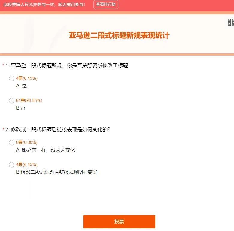 我们来看一下我们昨天收集的卖家标题新规的反馈。 你可以点击链接参与投票和查看结果: https://tp.wjx.top/vm/OvifvsZ.aspx#