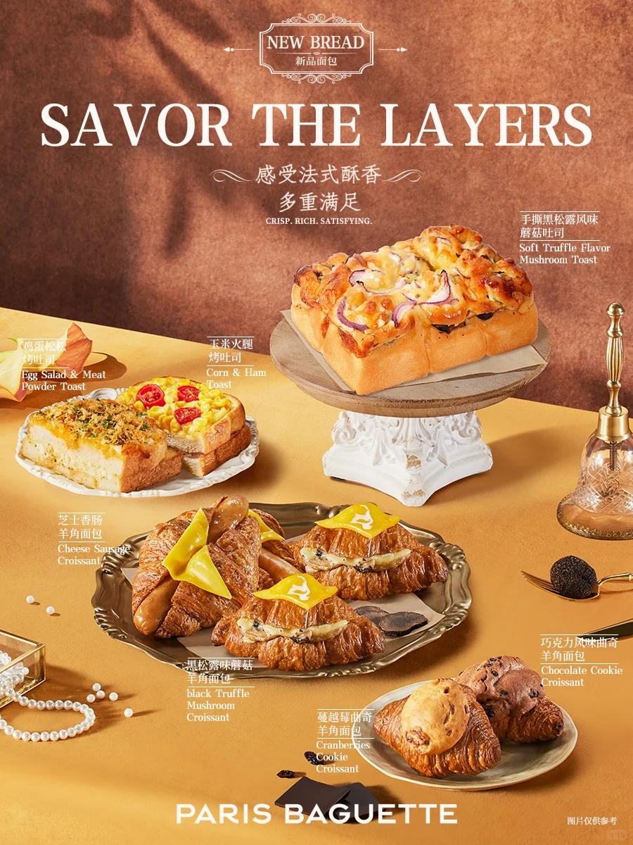 法式酥香大上新!酥香不变,风味更多,芝士香肠、黑松露味蘑菇、巧克力风味曲奇......与迷你羊角面包碰撞新口感。香甜草莓味动物奶油,裹挟糖水荔枝的清甜,「花漾荔枝玫瑰蛋糕」在舌尖悠然绽放。饱满蓝莓铺满蛋糕,「蓝莓森林蛋糕」带来清新酸甜口味体验。