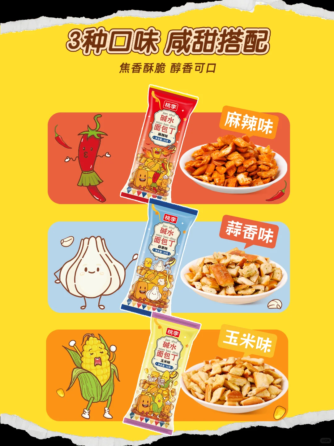 这也太tree了!咔嚓咔嚓脆的碱水面包丁,有麻辣、玉米、蒜香三个口味,又香又脆,根本停不下来。