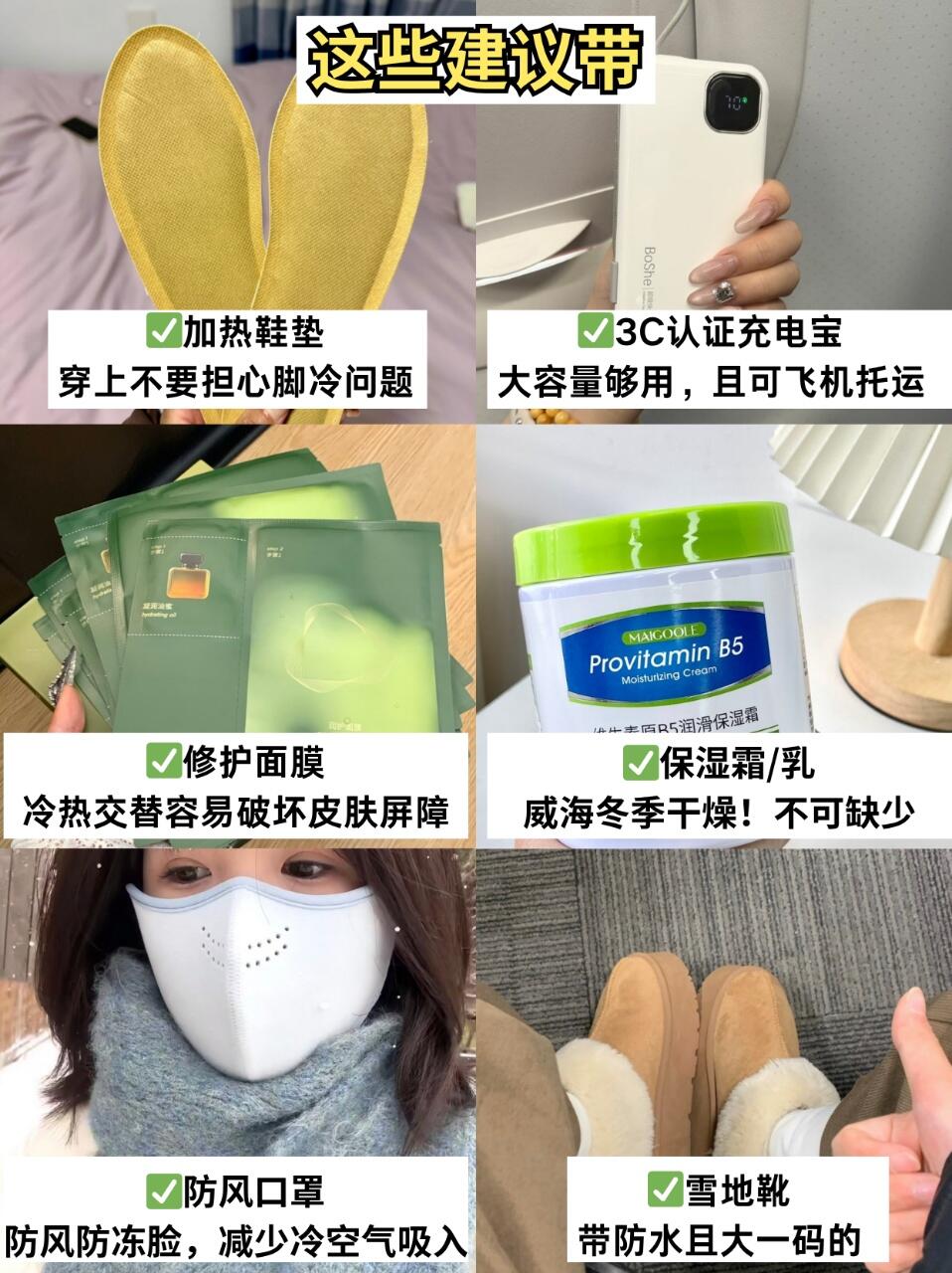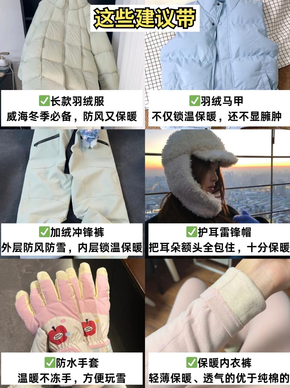 ✅带充电宝(选2万毫安有3C标识,可登机)、墨镜(防雪地反光)、保温杯(喝热水方便)。✅穿戴防风保暖衣物:触屏手套、长款鹅绒服、保暖帽(护耳)、防滑防水鞋。