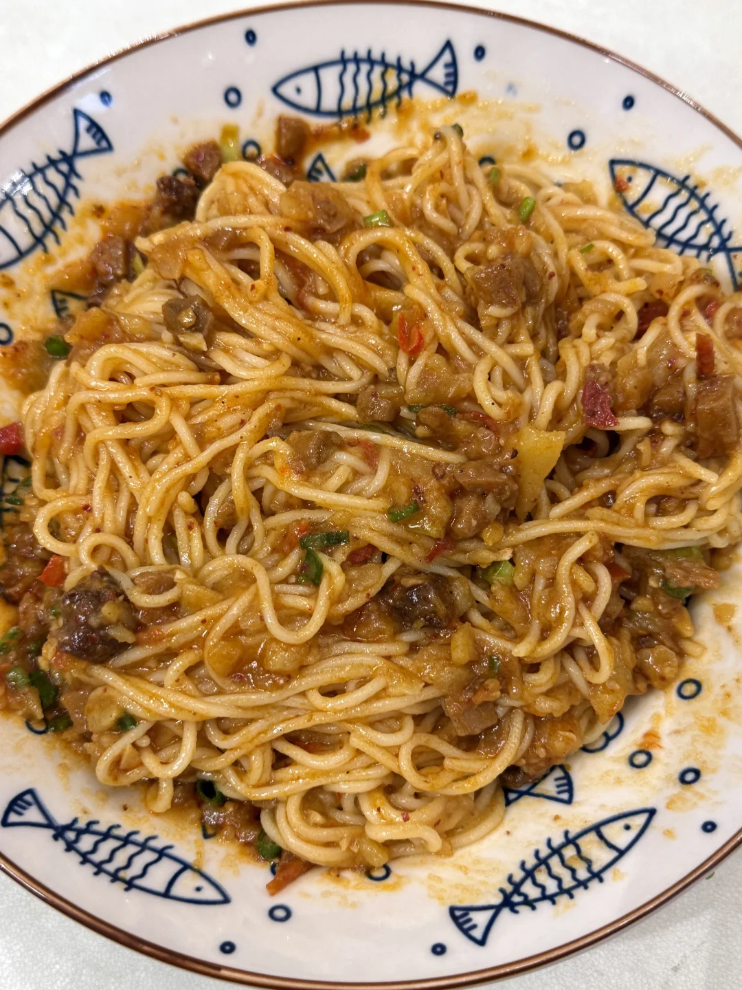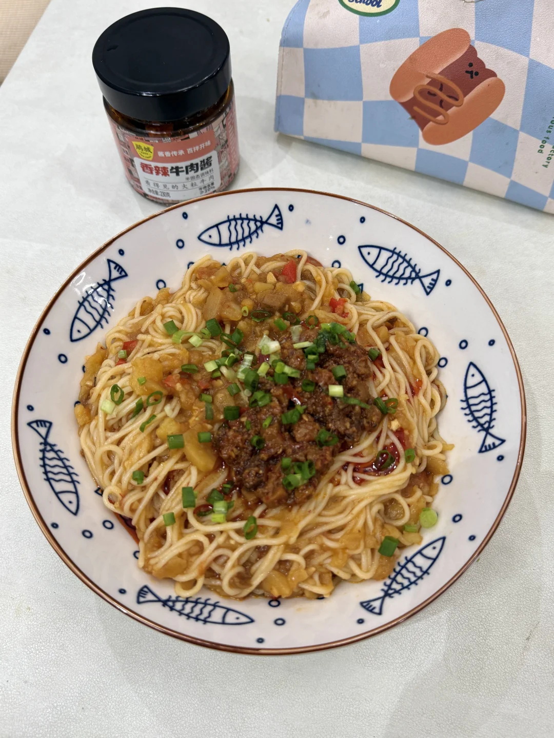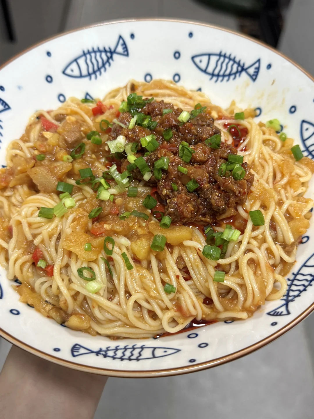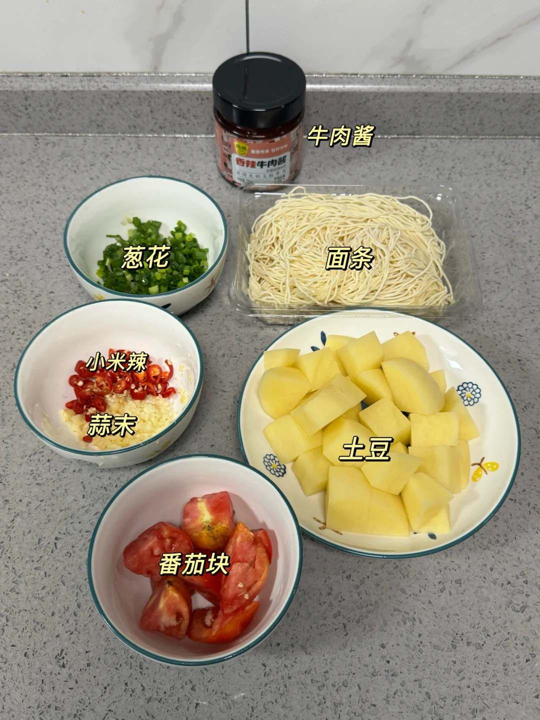 面条、土豆、鹃城牛肉酱、番茄、小米辣、蒜末、葱花