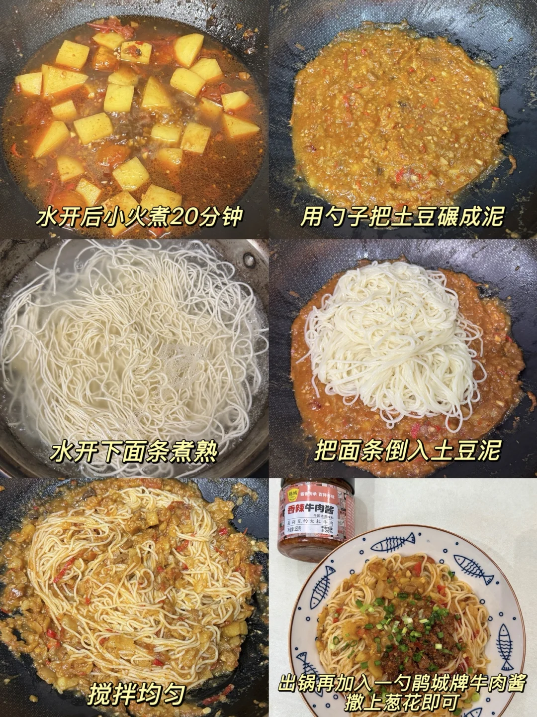 4️⃣水开下面条煮熟,放入土豆泥中翻拌均匀,出锅在家一勺牛肉酱撒上葱花即可