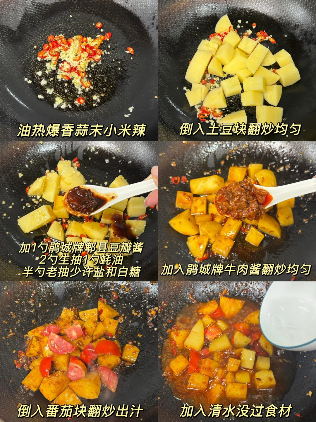 1️⃣锅中油热爆香蒜末小米辣,再加入土豆块翻炒均匀
