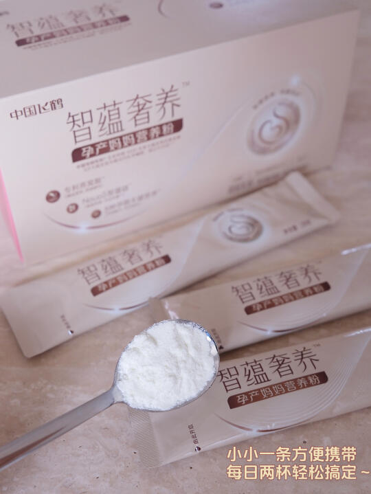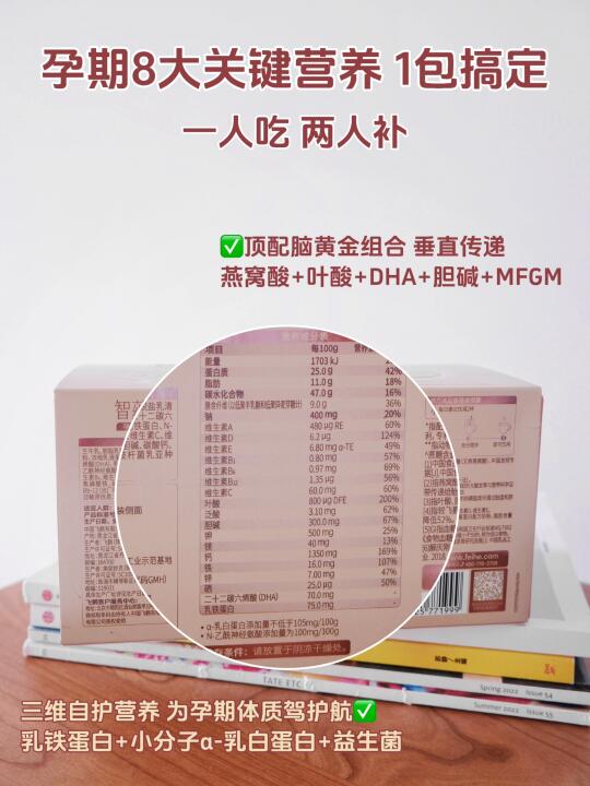 另外孕妇DHA、乳铁蛋白、叶酸等孕期必需的营养直接八合一打包好了,超级省心。每天随餐一包,自己和宝宝同时进补,超方便~