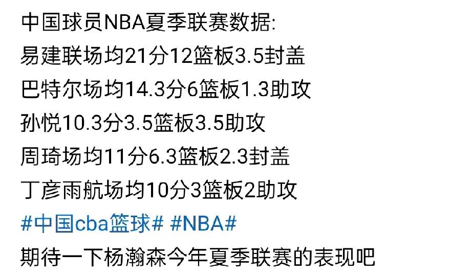 杨瀚森在登陆NBA的中国球员里,处于何种水平呢? 中国球员杨瀚森于今夏进军NBA,代表波特兰开拓者参与夏季联赛,其表现令中国球迷为之一振!在总共四场比赛当中,杨瀚森平均每场登场24.4分钟,能拿下10.8分、5个篮板、3.8次助攻、0.5次抢断以及2.3次盖帽,数据颇为全面! 在先后登陆NBA的十多位中国球员之中,就能够查询到的夏季联赛数据来看,易建联场均21分、12个篮板、3.5次封盖;巴特尔场均14.3分、6个篮板、1.3次助攻;孙悦场均10.3分、3.5个篮板、3.5次助攻;周琦场均11分、6.3个篮板、2.3次封盖;丁彦雨航场均10分、3个篮板、2次助攻,杨瀚森的数据只能讲是中规中矩,处于平均线水平。 夏季联赛的竞争激烈程度和正式比赛相比差得远,真正的考验是常规赛。在登陆NBA的十多位中国球员里,能打出姚明那样数据的人绝无仅有,能达到易建联水平的也极为稀少,我个人认为杨瀚森应当以王治郅为参照对象,争取在NBA长期立足并且有所表现! 你觉得杨瀚森在NBA能够达到怎样的高度呢?杨瀚林NBA 杨瀚森