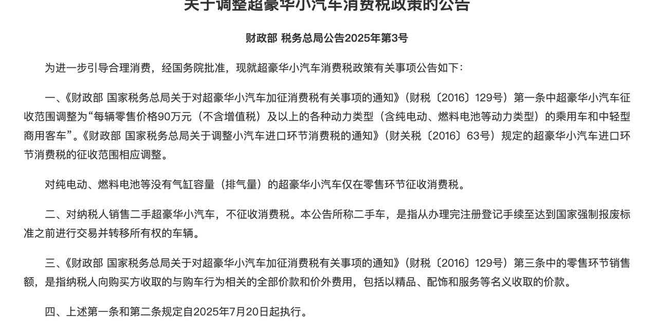 天塌了!豪车要涨价了 做销售的朋友和我说,他们的在售车型要被迫“涨价”了。7月20日起,售价90万元以上的汽车,将征收10%的“豪车税”,而在之前的起征标准是130万起。 很多人都以为影响最大的是奔驰、宝马、奥迪、保时捷以及法拉利、阿斯顿·马丁等这样的豪车品牌,其实被受伤的还是仰望、尊界这些人气最旺的顶级国产新能源汽车。毕竟,加上豪车税就一下子多了10万元左右的购车成本。