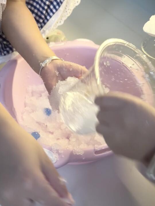 把尿不湿里面的吸水树脂挖出来 放适量水就变成了“沙冰” 但注意看护 不要让孩子误食