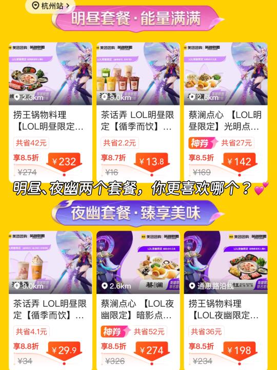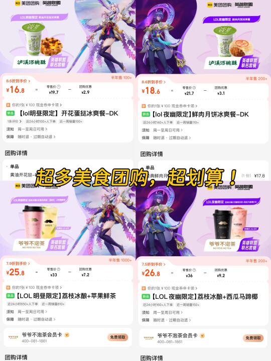 7.18LOL绽灵节限定福利上线✌️!美团团购牵手5⃣️家餐饮大佬搞事情,泸溪河和爷爷不泡茶的联名套餐我先锁死~而且英雄联盟有“明昼”“夜幽”两个阵营,就连美团团购的联名套餐里也有“明昼”“夜幽”两种选择,大家快为自己喜欢的阵营“站台”呀!线下团购了超多,买回来在家边看比赛📺边吃太爽啦!