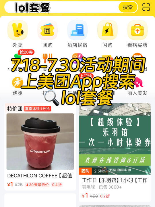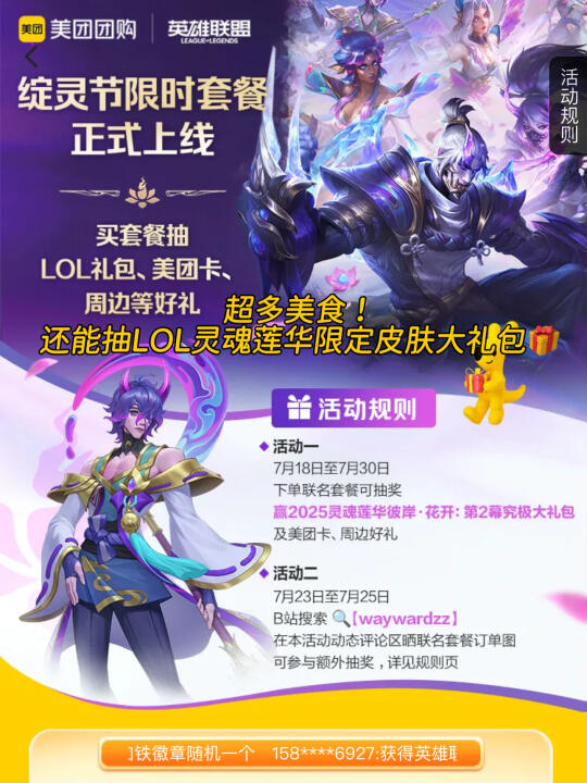 重点是!7.18-7.30活动期间上美团App搜【lol套餐】,除了能get这些超值美味,还能抽LOL灵魂莲华限定皮肤大礼包🎁!一边炫美食一边冲皮肤,这波血赚不亏~