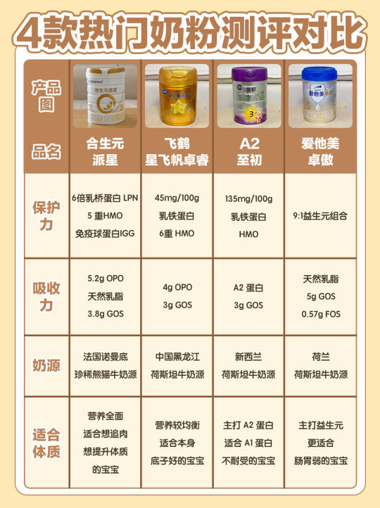 这期我准备了4款热门选手:合生元派星、 A2至初、爱他美卓傲、飞鹤星飞帆卓睿,从成分的角度给大家分享下!
