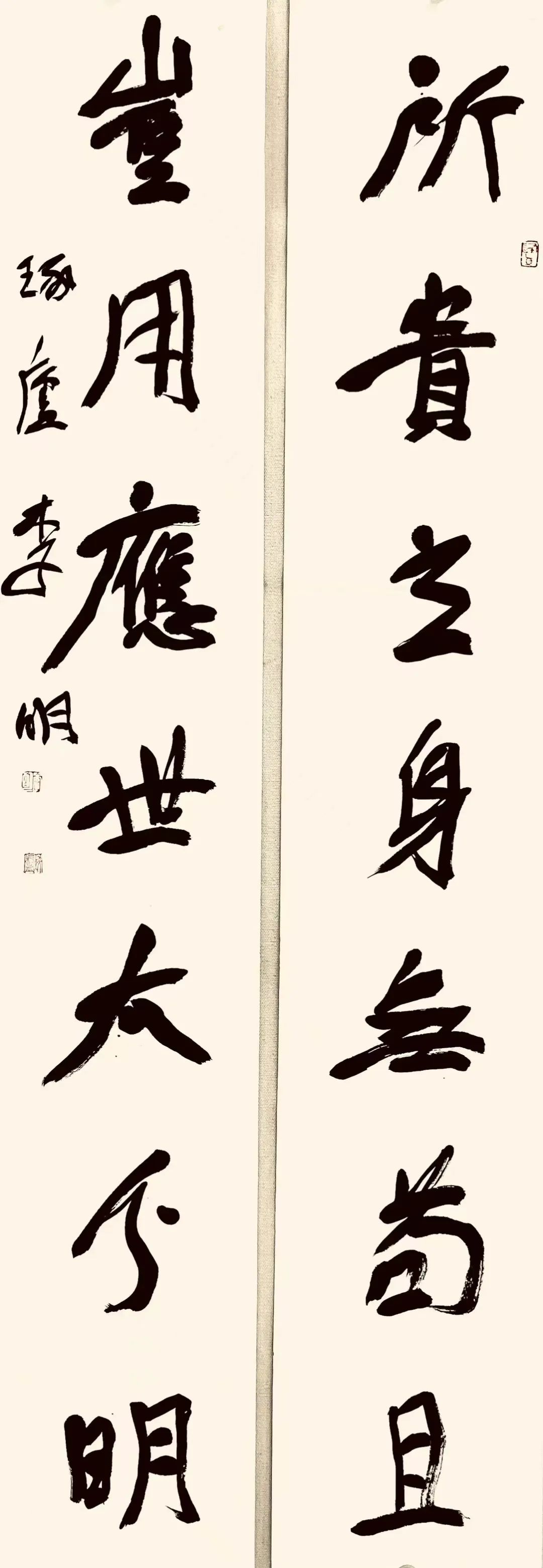 第五,书法进入当代,生态发生了巨大的变化。尤其是以展厅模式为主的观赏方式对书法创作产生了巨大的影响。我认为颜楷所具有的正大气象更适合放大书写,更适合展厅环境下的展示。在写“颜体”大字大幅作品时,并不是简单的小字放大,而是需要在用笔和结字上都要有所调整,有所侧重和强化,甚至要吸收和融合其它书体。比如碑的笔法和行书意味的融入对颜楷笔画质量和生动性都会有所提升。