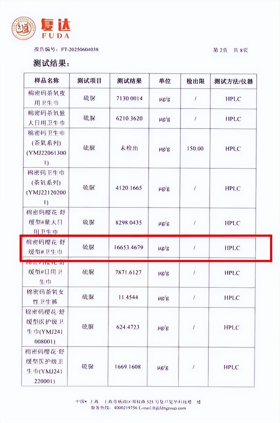 今年5月,王先生在自媒体上曝光“棉密码”卫生巾添加硫脲,并组织消费者集体送检。上海复达检测技术集团有限公司出具的检测结果显示,10份样品中有7份检出硫脲。后续消费者集体送检发现,2019年至2025年生产的多批次产品含超高浓度硫脲,最高达16653.4679μg/g。而硫脲被列入《危险化学品名录》,属于3类致癌物,能通过皮肤渗透进入人体,干扰甲状腺激素合成,影响多个器官。