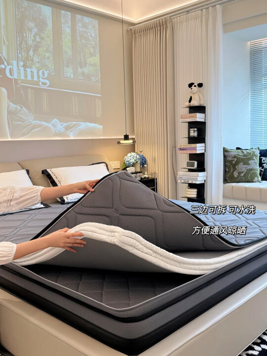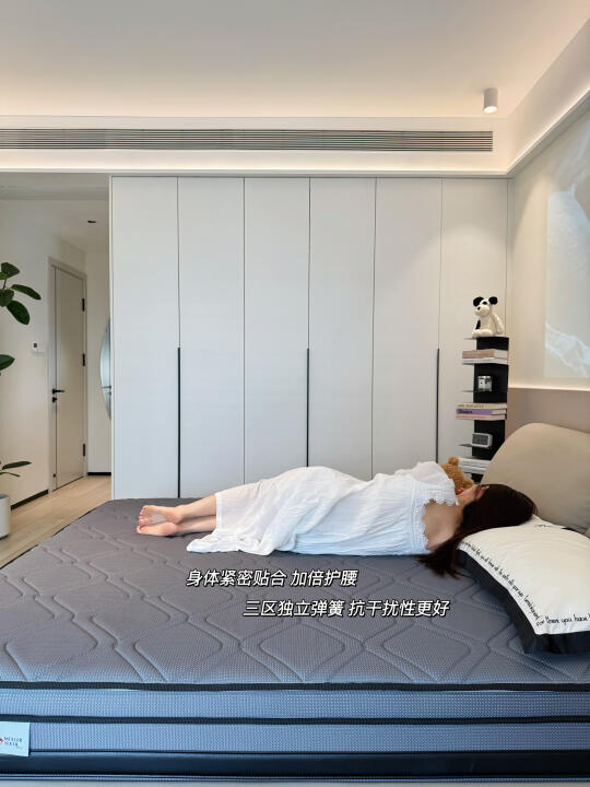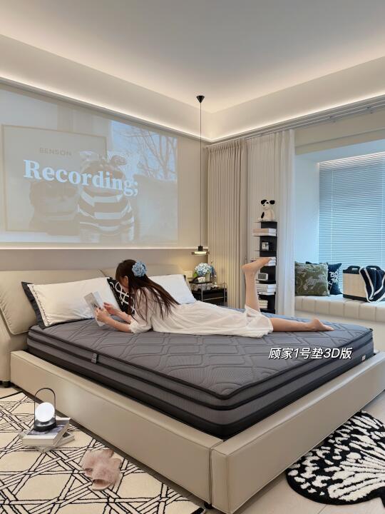 卧室我的充电场,所以在任何的装饰及用品上我的细节及要求都很高✨ 17平主卧,把它装修成极简风 整体色系⚫️⚪️🟤 没有做吊顶 设计了明装无主灯 保留原始层高 四周做了边吊线型灯 小细节却大大提升了氛围感 卧室硬装、软装固然重要❗️但更在意的还是舒适度~ ♥作为一个二胎妈妈,我发现带娃真是对我体力与精力的双重考验,每天睁开眼睛的那一刻就开始了连轴转,每天累的根本直不起腰,加上产后腰就不如以前,这要是晚上还休息不好,我无法想象我怎么处理如此多的琐碎事情。 ♥搬家前我家主卧次卧两张床垫都踩雷,不是太软就是太硬睡起来很不舒服。所以这次买床垫我就没少做功课,需要一个支撑性和舒适度都很好的,最好还有可拆洗的功能,更适合有娃家庭,之前就有听宝妈推荐顾家的1号垫,最近在选新的床垫时,还看到他们家床垫有180天的试睡,就果断入手了顾家1号垫的3D版~ ♥这款床垫的3D材质结构挺特别的,整张下来有两百多万个支撑点呢。实际躺上去,支撑感特别明显,但又不会觉得硬邦邦的。再加上三分区的独立弹簧,肩颈、腰臀、腿这些地方都能跟床垫贴得特别好,感觉每个部位都被稳稳托住了。 ♥之前买的床垫边缘很容易塌陷,没半年床垫就塌边了这款是加厚海绵围边,增强了边缘支撑力,我老公**斤睡在边缘也不塌的,加上下他内外都是透气材质,也不会像之前的床垫那样晚上被热醒,后背一身汗,娃睡醒身上也很干爽,床垫的表层可以直接拆掉水洗,娃尿床了也不怕,使用寿命也更久,这个配置这个价位,性价比直满~ ♥床垫目前使用一个多月了,从支撑性、睡觉的舒适感,和实用性都很满意,比我之前大几万的床垫好多了,床垫真的不一定要选贵的但一定要选对的~ 🍀自从入手了这款床垫每天都能拥有高质量的睡眠��幸福感真的拉满!据说这款顾家1号垫销量和口碑一直以来都很好,实测下来,同价位的产品中他家的床垫配置会更高,特别是宝妈真心推荐大家试试~