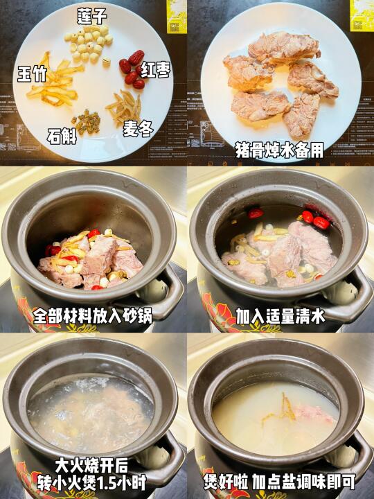 三伏天真的很热,人内火旺盛就会特别烦躁!加上熬夜加班[失望R]整个人的气色都差了[抓狂R]这个麦冬石斛汤、熬夜人士首选靓汤🍲清热解渴,养肝护肝[飞吻R]汤水清甜好喝[赞R]三伏天安排它再合适不过了~ - 🍲食材: 石斛、麦冬、莲子、玉竹、红枣、猪骨 - [清单R]做法: [一R]所有药材洗净,红枣去核,猪骨焯水备用。 [二R]所有材料下入砂锅中,加入适量清水 [三R]大火烧开,转小火煲1.5小时,出锅前加入适量盐 即可 - 用这个搭配煲出来的汤清甜不油腻,睡眠不好,小朋友有口气,大朋友经常烟酒,熬夜上火的,一家大小都适🈴喝这个汤。帮助自己恢复最佳状态!