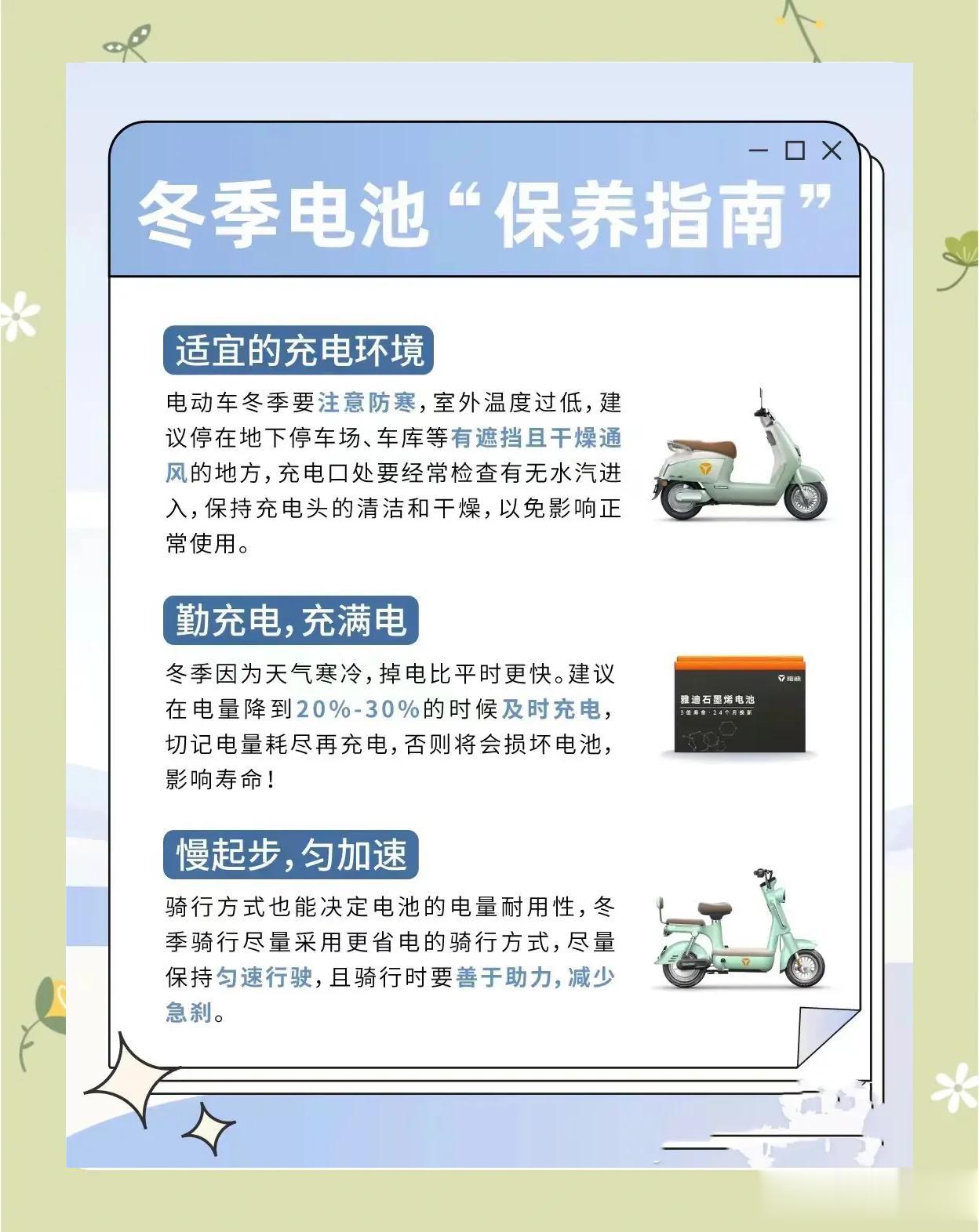 夏季回来以后让电池散热一个小时以后再充电,可以避免高温充电将电池充鼓包,充足电以后让电池散热30分钟以后再使用。冬季受低温影响电池容量衰减,电动车回来以后电池还要有余温,可以立即对电池进行充电,充足电以后再延长浮充一个小时,及时切断电源。