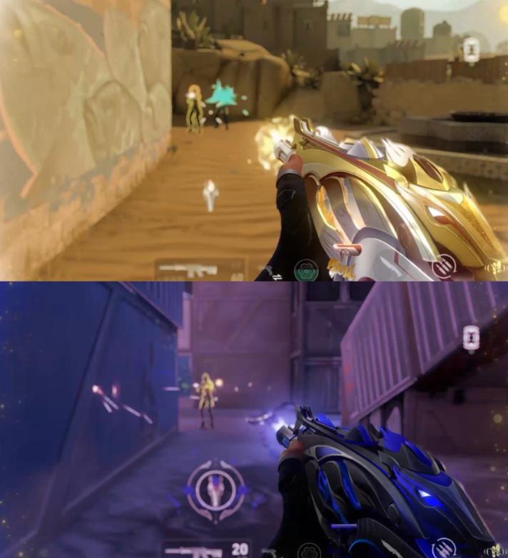 以登场率最高的幻影为例。整把枪的视觉语言就是"蓄势待发的骏马":枪身主体是马头、马眼、马鬃的抽象化呈现,握把与弹夹的造型暗合马蹄形态,再叠加流光溢彩的动态光效。持枪移动时,视觉上有种骏马在战场奔腾的动感,张力十足。