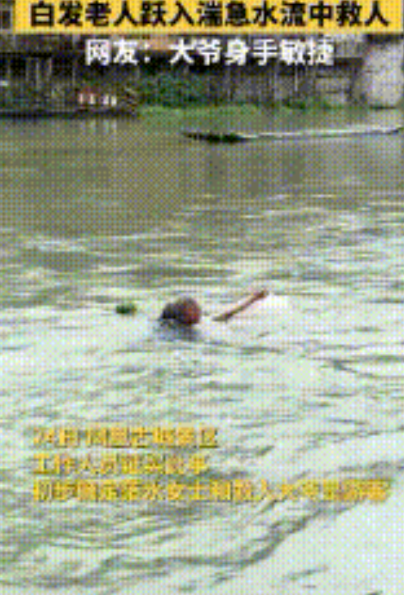 凤凰古城,一女游客不小心跌入激流的水中,岸边的人看到高呼着“有人落水了,有人落水了。”女子在水中伸出手双手,使劲的仰起头,顺流而下。 女子这样的方式明显不会游泳,但懂得自救。 一位头发花白的大爷跳入水中,快速挥动双臂游向落水女子,岸边有女子喊道:“爸爸小心点,爸爸小心点。”还有男孩的声音喊道:“爷爷小心,爷爷小心。” “爸爸”与“爷爷”的呼喊声中,有着焦急与担心。 大爷快速游到女子身边,从背后抓住女子的衣服,拉着女子游到岸边。 岸边一位中年女士,和黄衣服男孩赶紧接过大爷手中的女子,把她放在岸边。 女子惊慌未定的坐在地上,喘着粗气的说:“谢谢、谢谢。” 大爷笑着说:“没事,没事,举手之劳。 随即,大爷穿着湿漉漉的衣服,带着中年女士和男孩离开了。 景区认定大爷和落水女子都是游客,正在寻找见义勇为的大爷,希望有知情人提供消息。 救人一命,胜造七级浮屠。 大爷救人之后默默离去,他救人并不需要任何的回报,只是不能眼睁睁的看着一条生命消失,这是一种深刻在骨子里善良,也是我们每一个人学习的榜样。