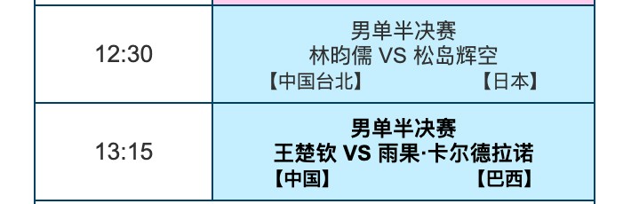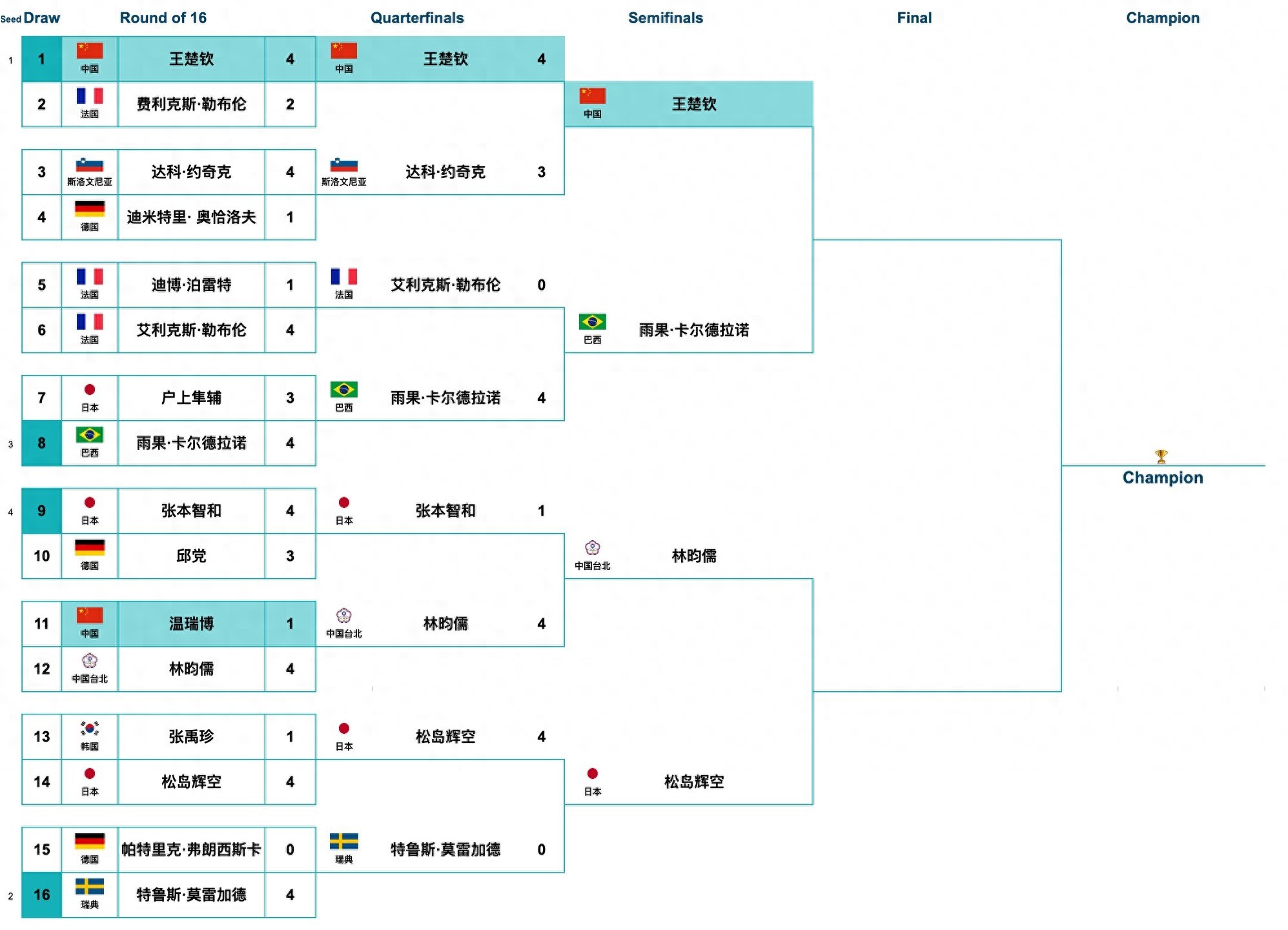根据上图的四强签位表,我们发现以上四人都是国际乒乓球天花板级别的存在。第一场男单半决赛,王楚钦打雨果。第二场男单半决赛,林昀儒打松岛辉空。
