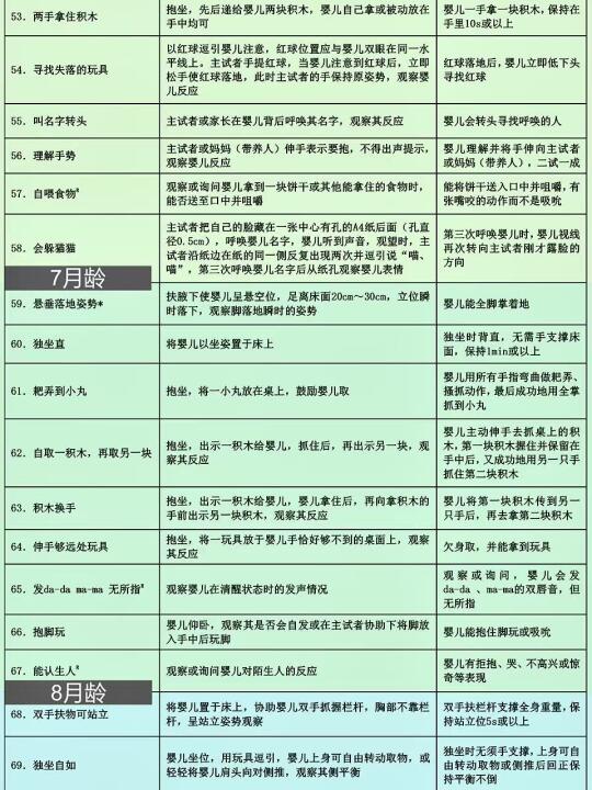 上周带宝宝去做儿保,🧑⚕️医生用的就是这份卫健委出的0-6岁儿童发育行为评估表📝 这表格可详细了,按月龄把宝宝应该会的小技能都列出来了,新手爸妈照着这个在家做早教特别方便~ 好多儿童🏥和专业机构都用它,比网上找的杂七杂八的资料靠谱多啦! 🌈已经按月龄用不同颜色区分好了,宝宝现在该会啥、接下来要练啥,一眼就能看清楚,真的超实用!建议收藏起来,随时翻出来对照着做哦~