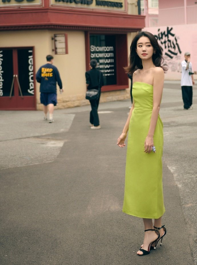 张小斐 气质女神惊艳亮相!无肩带绿裙配黑高跟,优雅魅力无人能敌!