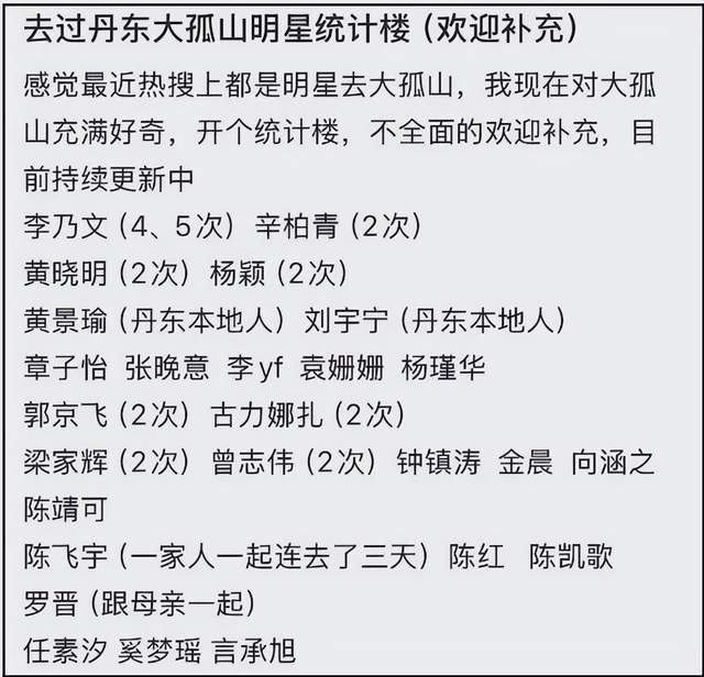 先捋一下这事有多离谱。白鹿、孟子义、曾舜晞、陈鑫海,四个人把大孤山带火了,于正本来美滋滋晒个游客照,结果评论区炸了——不是夸他带火景点,是直接扒出了一份近50人的“大孤山明星访客名单”。这名单有多疯?章子怡、陈凯歌、曾志伟、梁家辉、黄晓明、秦岚、张韶涵……往下还能拉,关之琳等老牌艺人的名字也在列。