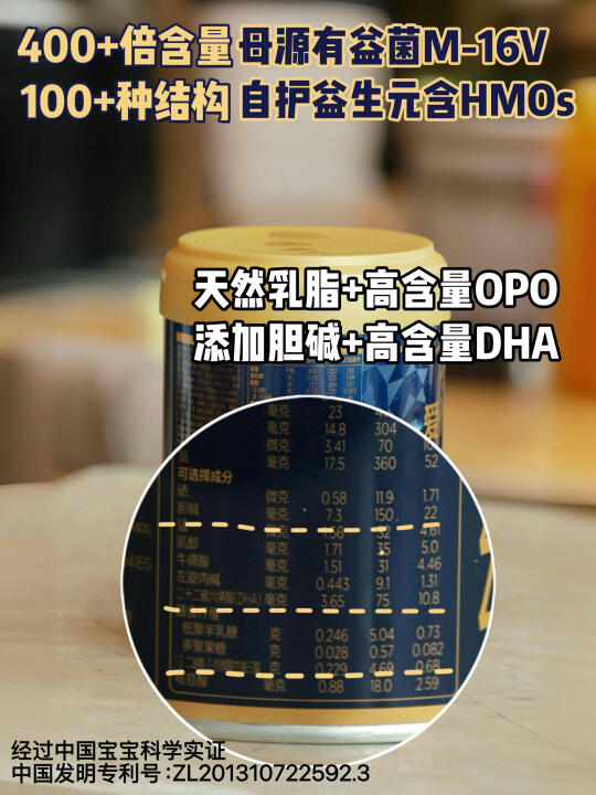 它不仅成分里添加了大师级母源有益菌M-16V,添加量也非常奢侈,足足有400+倍实证用量,就这一勺奶粉里就有一亿活菌!它还是宝宝肚肚里的“原住民”,天生亲和宝宝肚肚。同时,还获得了中美双认证,且安全应用历史超过60年。不愧是大师级的珍稀菌株!