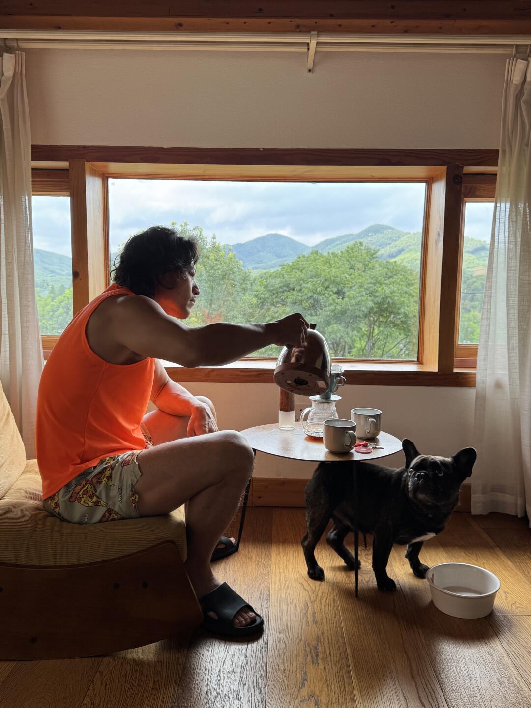 我们的「山居小监工」——狗子🐶(疯狂摇尾巴中)也准时上线!它负责在脚边转悠、嗅咖啡香、以及用湿漉漉的眼神企图分一杯羹(当然不可能!小狗不能喝咖啡!)。有毛孩子陪伴的山野清晨,快乐直接翻倍!💕