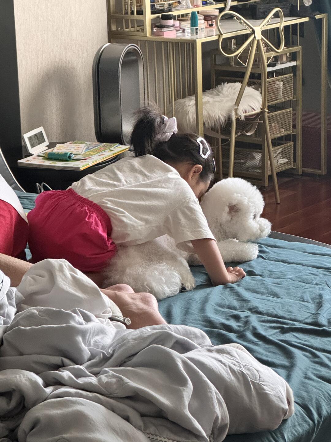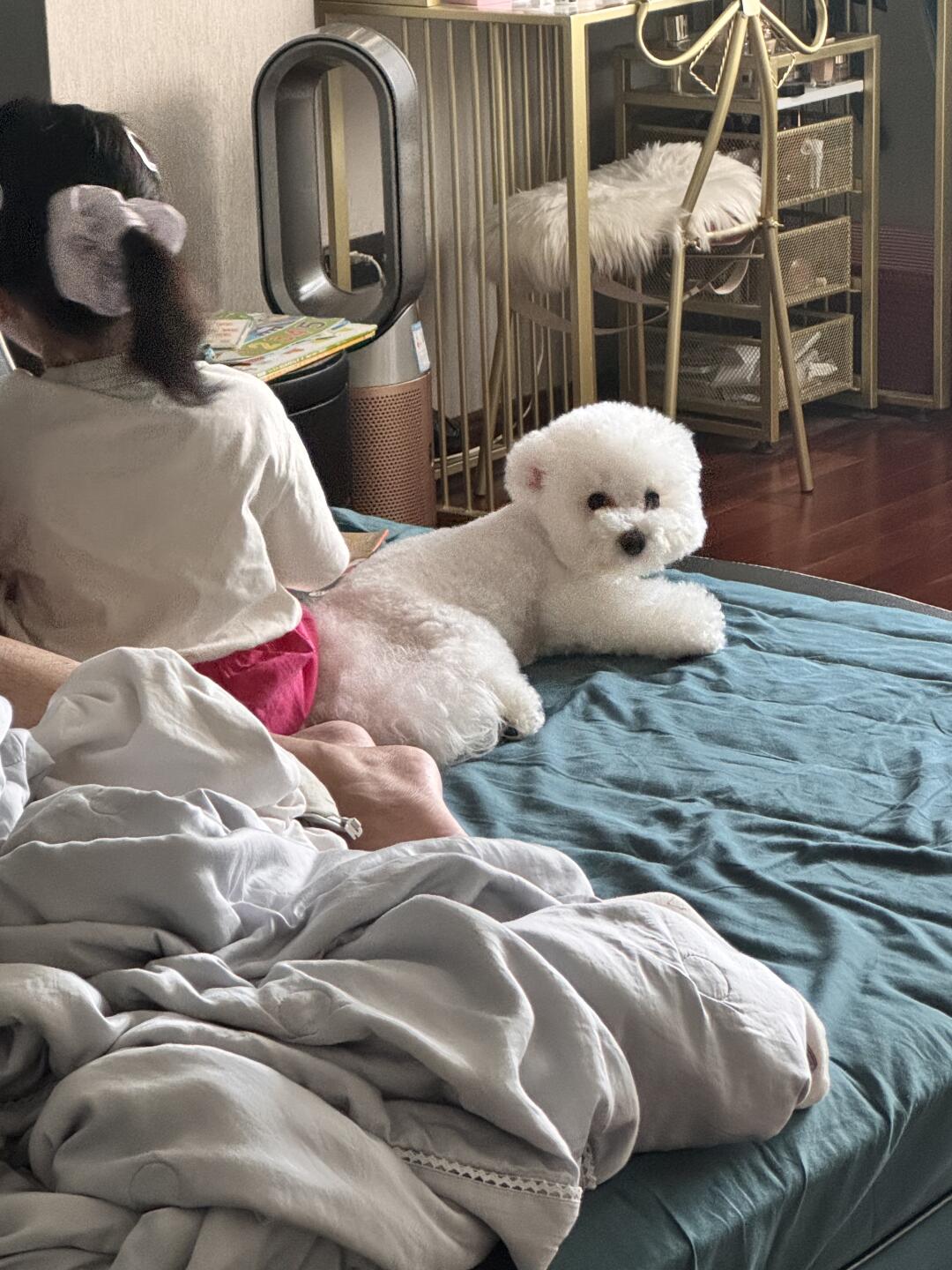 菜妈在客厅玩着,突然发现俩小的不在身边,并且没有声音,就很害怕,马上起身去找,来到主卧,发现这搞笑的一幕,湖南菜现在慢慢愿意贴近汤汤了(平时没少给零食,喂出来的友谊不知道长不长久…),汤汤管自己看书,菜菜边上趴着休息,汤汤时不时凑过去闻一闻…但是可以看出湖南菜对于汤汤的举动还是嫌弃的…哈哈哈哈哈
