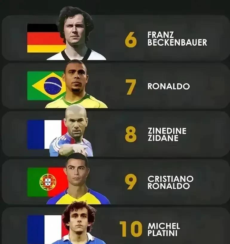 《433》评出的足球历史十大天王,估计又伤了C罗球迷的心了! 在这份榜单中,梅西、马拉多纳、贝利位居前三没有争议,但三人中究竟谁前谁后目前没有定论! 四至八名分别是迪斯蒂法诺、克鲁伊夫、贝肯鲍尔、大罗和齐达内,C罗排在第九!C罗之后是普拉蒂尼。 C罗之前的5人,在个人进球数据、俱乐部成绩等方面无法与C罗相比,有几人(贝肯鲍尔、大罗、齐达内)比C罗强的是有世界杯冠军,迪斯蒂法诺、克鲁伊夫的国家队成绩还不如C罗! 因此,将C罗排在这5人之后位居第九,估计很多人有异议,尤其不爽的是C罗数以亿计的球迷们[捂脸]