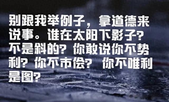 别跟我举例子,拿片面的道德来说事。谁在太阳下影子?不是斜的?你敢说你不势利?你不市侩? 你不唯利是图?