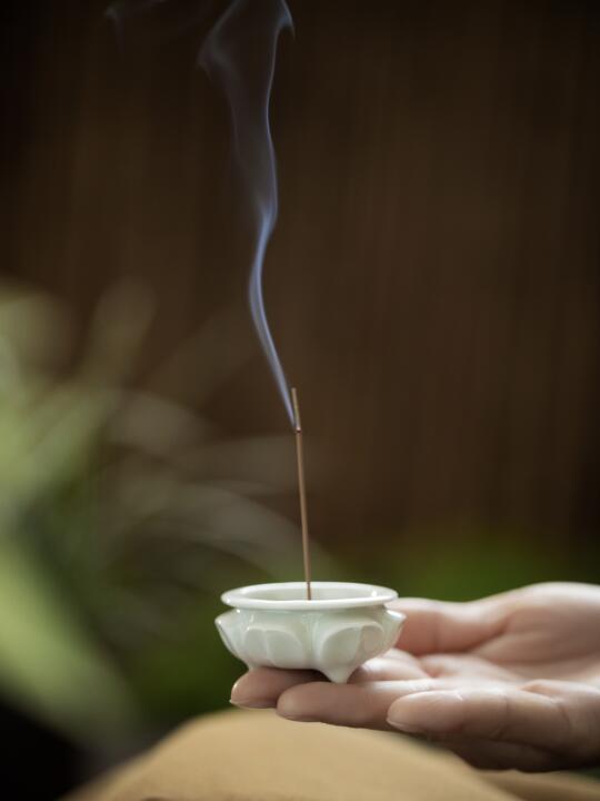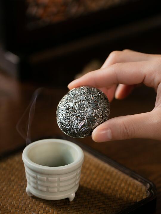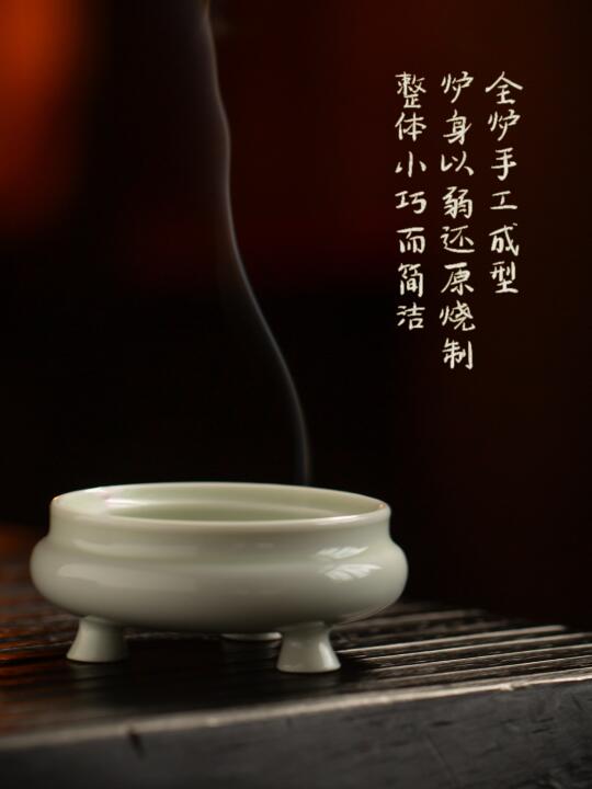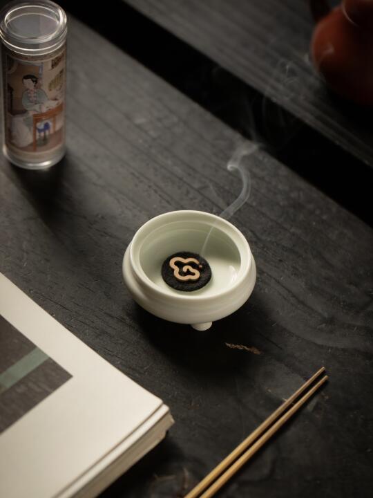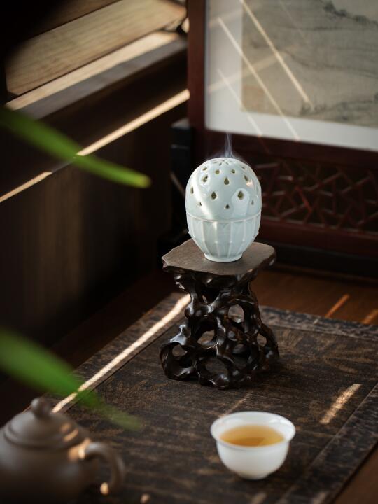 釉色通透似冰,玲珑可卧掌心,雕花纹路隐现。旅途或案头,燃一枚小香片,烟影绕腕,随身便是清凉处。