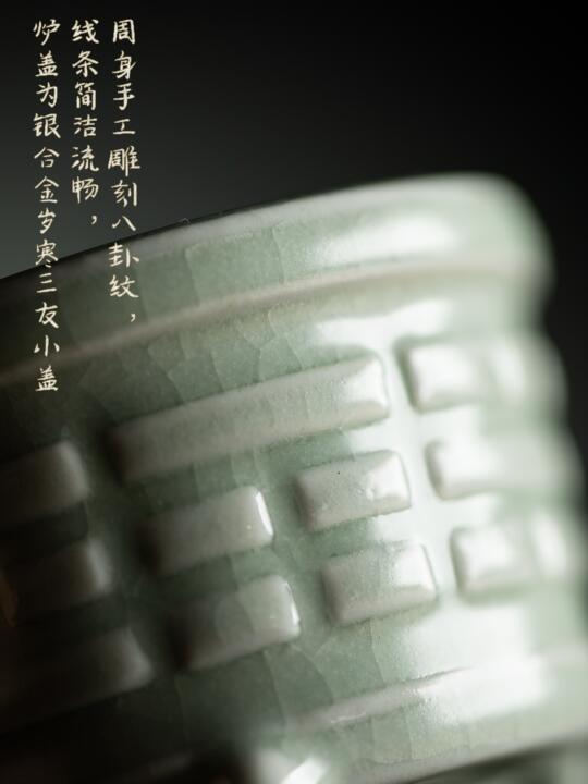手工刻八卦纹,庄严中见精巧。釉色温润,配银合金“岁寒三友”盖。打一炉香篆,烟影穿行卦象间,静思生凉意。