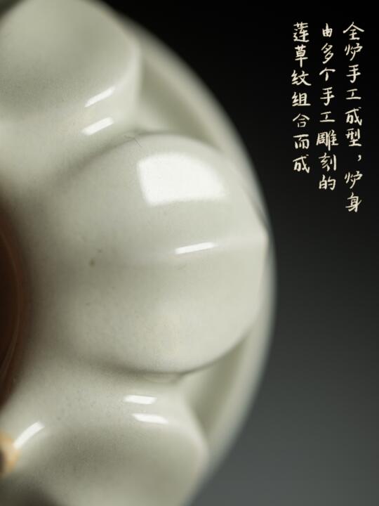 灵感源自明宣德炉,周身莲草纹灵动舒展。覆着温润草木灰釉,小巧如一枚清露。点上香片,青烟缭绕莲瓣间,似见雨后荷塘。