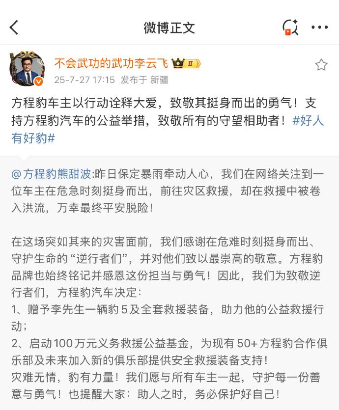 更暖的是后续:比亚迪车主好人有好豹,比亚迪不仅给这位平民英雄送了新车和全套救援装备,还掏出100万计划启义务救援公益基金,为善意与勇敢筑牢后盾。这波操作完美诠释了什么叫"你守护世界,我守护你"。难怪车主脱险后第一句话是"下辆车还选方程豹"——车主心里揣着团善良的火,而豹5就是那件最可靠的铠甲。#方程豹给见义勇为车主送车#