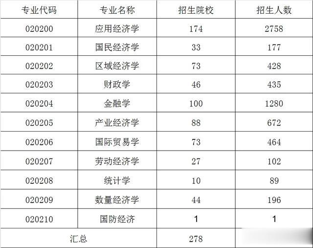 在本科阶段,经济学门类下设置了4个大的一级学科,分别是经济学类、财政学类、金融学类、经济与贸易学类。在研究生阶段,02经济学门类下设了应用经济学一级学科,学科代码为 0202,下设10个主流的二级学科,分别是国民经济学、区域经济学、财政学、金融学、产业经济学、国际贸易学、劳动经济学、统计学、数量经济学、国防经济。其中,有些学校是不区分细分方向按照一级学科应用经济学招生,有些学校是按照细分的二级学科招生。无论是0202应用经济学还是其下设的二级学科,都是可以报考的专业。