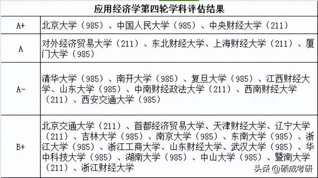 根据全国第四轮学科评估结果,应用经济学学科评估最好的学校有3所,分别是北京大学、中国人民大学和中央财经大学。在专业排名 B+及以上的 31所学校中,有16 所985 院校8所 211院校,还有7所是普通院校,分别是东北财经大学、江西财经大学、首都经济贸易大学、天津财经大学、浙江工商大学、山东财经大学和浙江财经大学。这7所虽然不是 211或 985 高校:但他们应用经济学的整体实力都很不错,特别是东北财经大学,学科评估为 A。