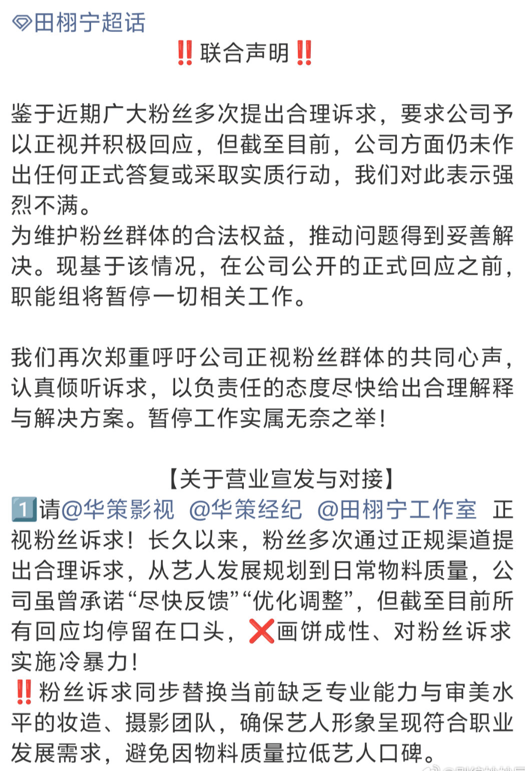 田栩宁后援会发布了一则声明,说是要暂停相关工作。这话一出,粉丝们立刻炸开了锅,好比嘴里含了颗“惊爆弹”,瞬间就炸出了“这是咋回事?爱豆咋了?”的万般疑问。大家都急得像热锅上的蚂蚁,生怕这是啥不好的信号。可还没等大家把这“暂停”的焦虑消化完,1小时20分钟不到,数据组、网宣组这些核心小组就像被按了“重启键”,又开始“嗡嗡”地运转起来。这效率,简直比网速还快!粉丝们迅速澄清,“暂停”只是针对跟公司对接的那些“协调性工作”,啥日常应援、公益、数据维护这些“核心业务”可从来没停过。10月15日,超话更新得那叫一个热闹,商务支持也稳稳当当,公益项目更是有条不紊地运转着。