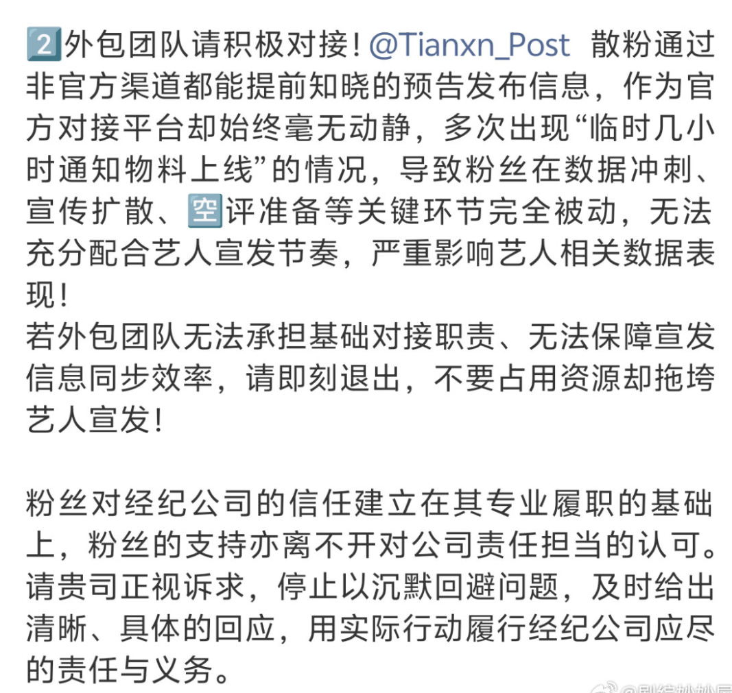 这事儿背后,可藏着粉丝们的一番苦水呢!粉丝们对经纪团队的专业度一直挺焦虑的,这可不是一天两天的事儿了。他们就像操心的“老母亲”,天天担心经纪团队会不会把爱豆给“带沟里去”。每一次爱豆的活动安排、作品发布,粉丝们都要操碎了心,生怕哪一方面出了岔子影响到爱豆的“完美形象”。他们对艺人的职业形象可是高度维护,这跟保护珍宝似的,不允许有一丁点儿瑕疵。这种“高度焦虑”和“高度维护”,就跟“追剧追到只剩两集还没更新”那心情似的,急得上火,却又不得不持续关注,希望能有个完美的结局。