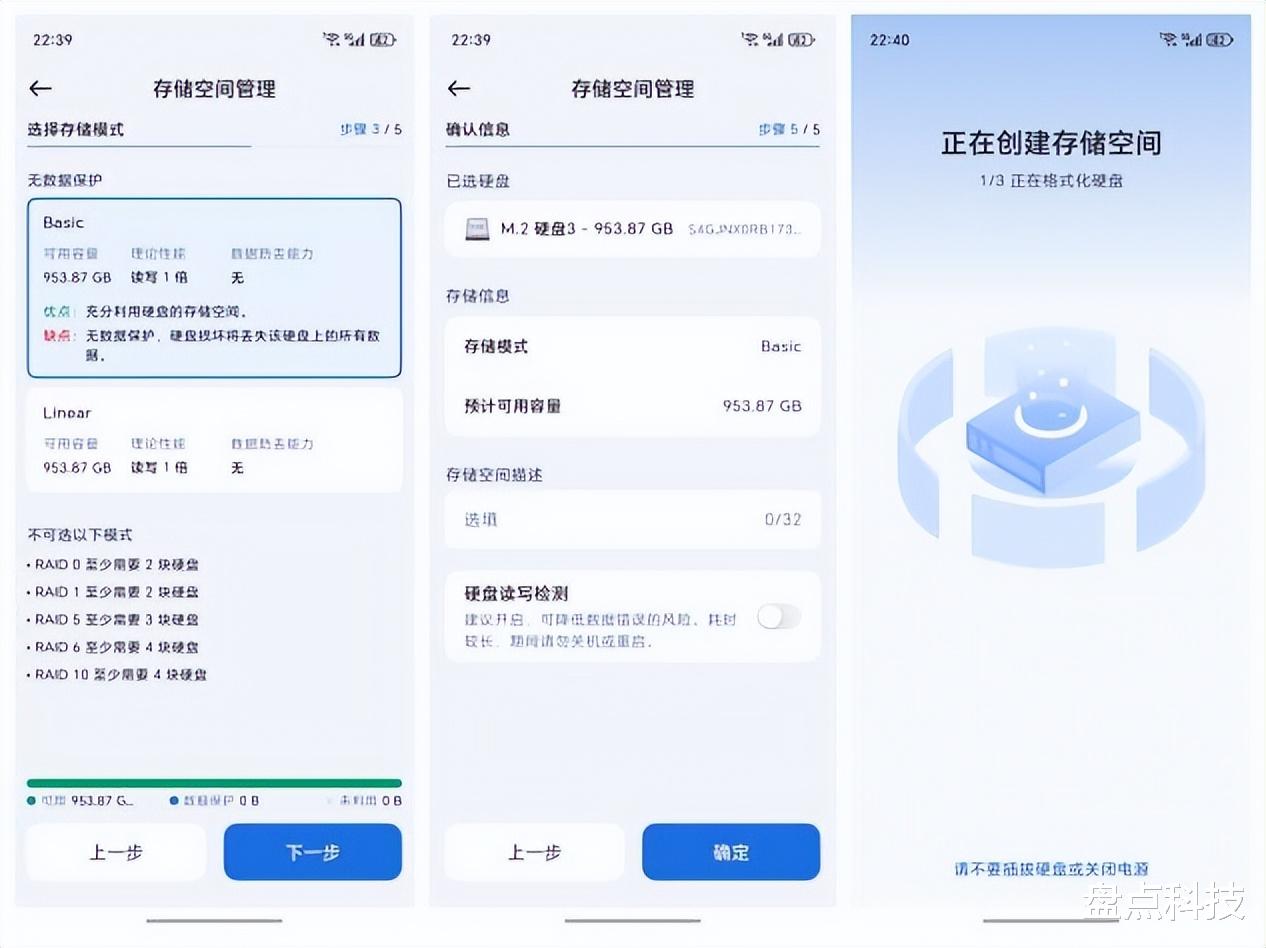 进入后第一件事,那当然是创建存储空间,根据提示创建存储空间-选择文件系统-选择硬盘-选择存储模式,盘哥因为暂时只安装了一块固态硬盘(除系统盘外),所以目前只有两种模式可选,如果拥有2块及以上就可以有更多存储模式可选,有条件的可以选择RAID 1,数据保护能力更好!