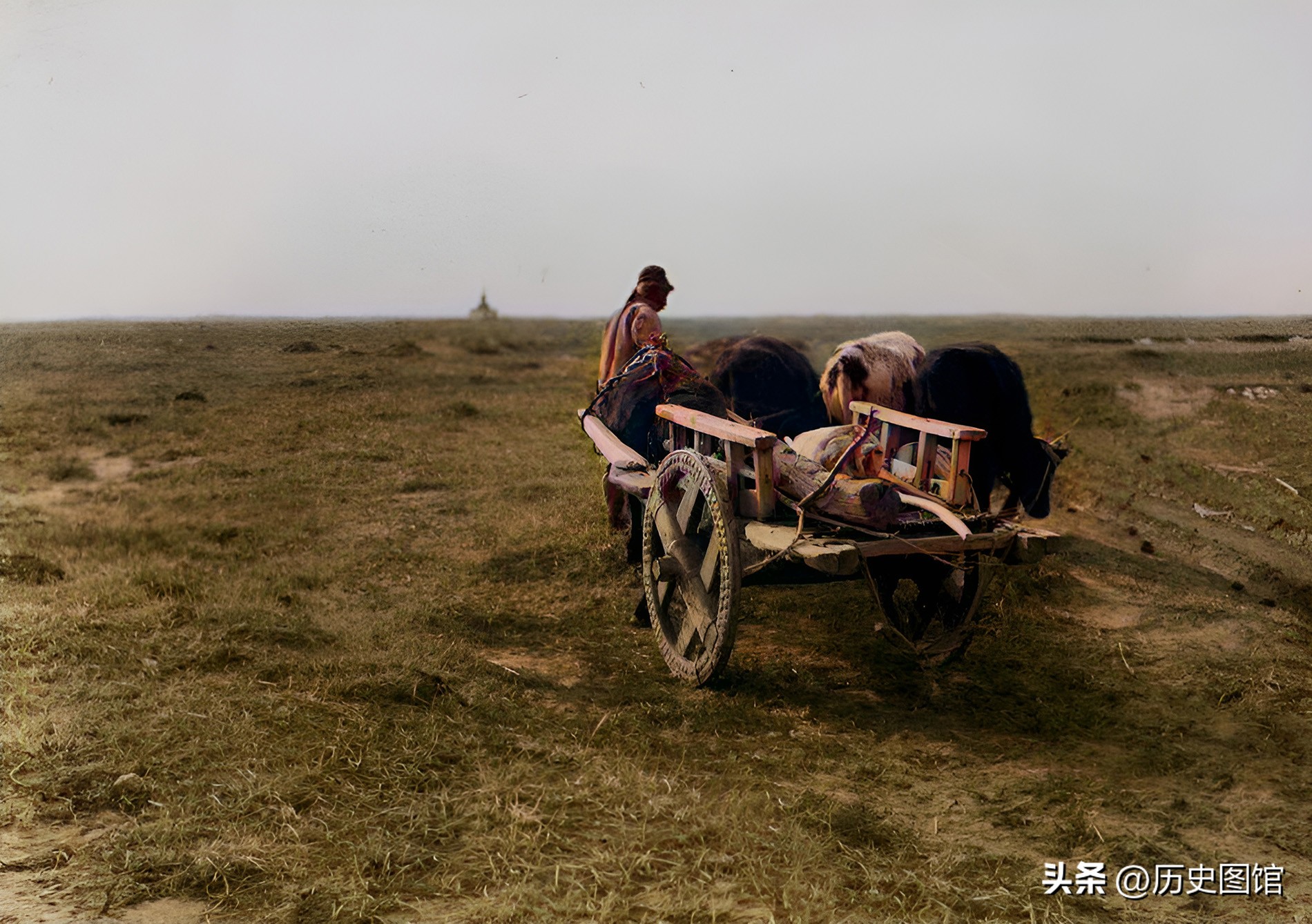30年代,内蒙古草原上,一辆“勒勒车”正在前行。车身小轮子很大,是当时草原牧民主要的交通运输工具。