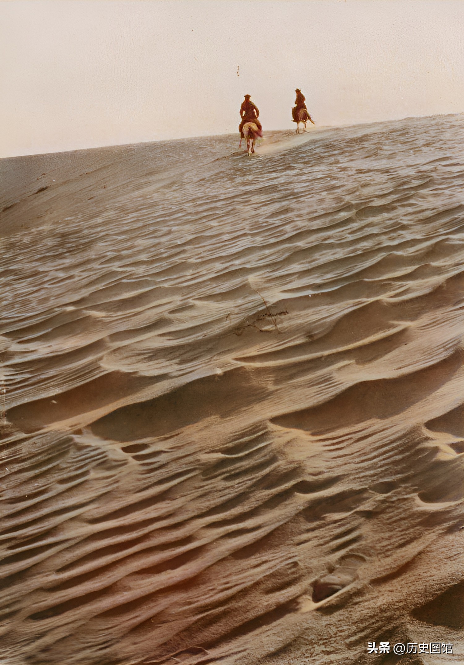 内蒙古不仅有草原,也有沙漠。照片中,两个牧民正骑着马从沙丘上疾驰而过。